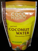 I am a lover of coconut water, Taste Nirvana brand specifically, but at $2 a bottle, it's kind of like my own "starbucks" habit, only better for me. So when I found a product that would allow me to make my own coconut water I was intrigued. Cocohydro is basically dried/evaporated coconut water; a powder you mix in to plain water and thus creates coconut water. The brand offers three flavor options: plain, pineapple, and pomegranate raspberry. I happened to come across a sample of the pineapple water.